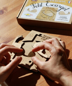 Ce jeu est très simple : tu disposes de 4 escargots en bois, 3 grands et un petit, et il « suffit » de les placer dans le gabarit, ensemble, sans les superposer, bref de trouver LA combinaison qui fait qu’ils logent dans le cadre !