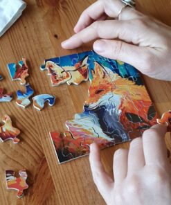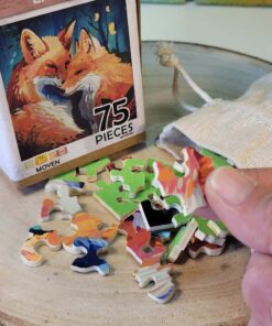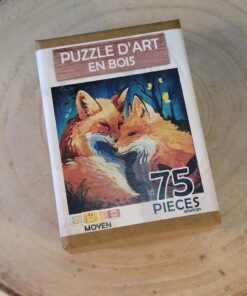 Prends cinq minutes pour t’évader avec ce petit puzzle en bois illustré de deux renards malicieux dans la forêt.