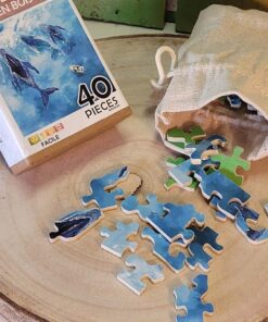 Prends cinq minutes pour t’évader avec ce petit puzzle en bois illustré de trois baleines majestueuses.